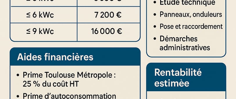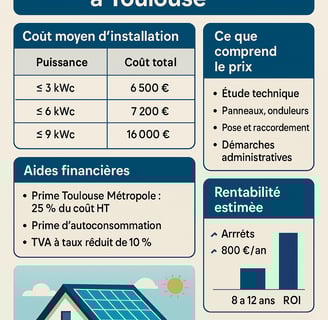 Découvrez le prix moyen d'une installation photovoltaïque à Toulouse : tarifs par kWc, études de cas, aides locales, rentabilité et comparatif revente/autoconsommation en 2025.